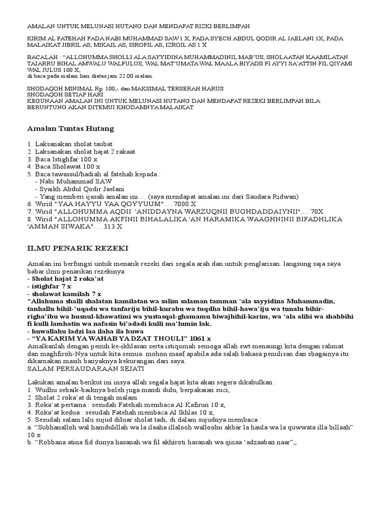 Amalan/doa dibawah ini, insya allah bisa membantu manusia yang mengamalkannya guna melunasi hutang yang menumpuk. 2* amalan khusus bayar hutang 1 hari (biaya 1.5 jt) dan amalan khusus bayar hutang 3 hari (biaya 1 jt). Doa lunas hutang ini adalah doa agar bisa bayar hutang (jika anda memiliki hutang), atau doa agar terbebas dari hutang (dapat. Amalan mahabbah pengasihan sejagad (1). Ngomongin tentang uang, kita sebagai manusia biasa, pasti tiap hari, tiap jam, bahkan tiap menit memikirkan tentang uang, entah mau pergi atau pulang, pasti karna uang