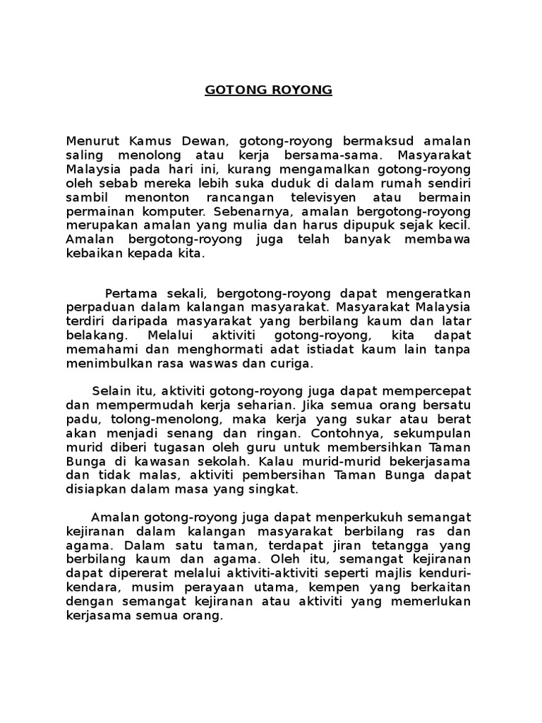 Esei Menggalakkan Gotong Royong from imgv2-1-f.scribdassets.com Amalan ini telah diprakltikan dan di warisi sejak zaman berzaman. Sebenarnya, banyak faedah dapat diperoleh daripada. Dalam kehidupan sekarang yang semuanya berkait dengan kewangan sudah pasti amalan gotong royong ini mampu menjimatkan kos dan tenaga ketika menjalankan sesuatu majlis itu. Gotong royong amalan yang semakin dilupakan. Semua pihak memahami kepentingan amalan ini diamalkan terutama ketika kegawatan ekonomi melanda sesebuah negara itu. Sebab sebab amalan gotong royong semakin pudar berat sama dipikul, ringan sama dijinjing. Tentu saja surutnya semangat gotong royong tanpa alasan. Oct 11, 2009 · amalan ini tidak akan dilupai.